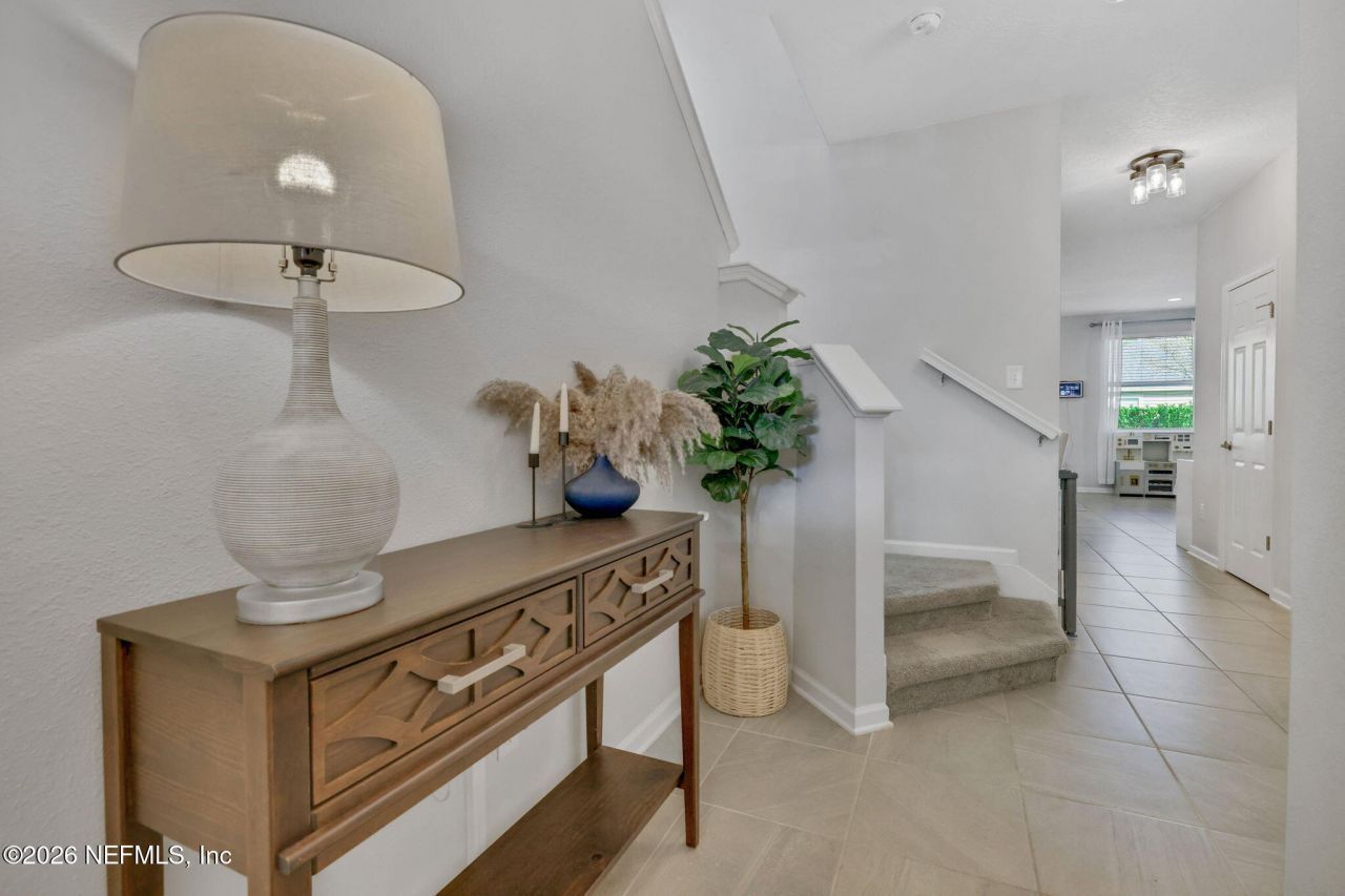 Located in desirable Bartram Park Preserve, this well-maintained home offers a functional layout. Tile flooring runs through the main living areas, and a private office with French doors provides a quiet workspace. The open-concept design is filled with natural light and features a spacious kitchen with granite countertops, large island, stainless steel appliances, and a breakfast nook with upgraded lighting. Upstairs, a loft offers space for a playroom or media area. The laundry room is conveniently located upstairs, and the washer and dryer convey. The primary suite features a tray ceiling, large walk-in closet, along with dual sinks, garden tub, and separate tile shower in the bath. Exterior updates include fresh paint with Duration Home and gutters added in 2023. Enjoy outdoor living with a screened lanai, extended paver patio, and fully fenced backyard. Community amenities include a pool, splash pad, fitness center, and playground.